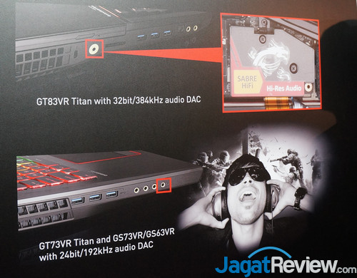 Mengingat solusi audio di notebook umumnya tidak bisa diupgrade dengan mudah seperti di desktop, MSI langsung memberikan Audio premium pada beberapa lini notebook-nya dengan menggunakan DAC berkualitas tinggi. Beberapa model (seperti GT83VR/GT73VR) juga dilengkapi speaker rancangan Dynaudio yang dipercaya memberi pengalaman audio yang immersive.