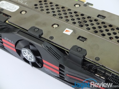 Sama seperti graphics card kelas atas pada umumnya, Gigabyte juga melengkapi VGA card GTX 1070 Xtreme Gaming ini dengan backplate yang tergolong tebal dan kokoh. Di bagian tengah backplate ini terdapat logo Gigabyte Xtreme Gaming. Backplate ini juga memiliki corak garis berwarna orange.