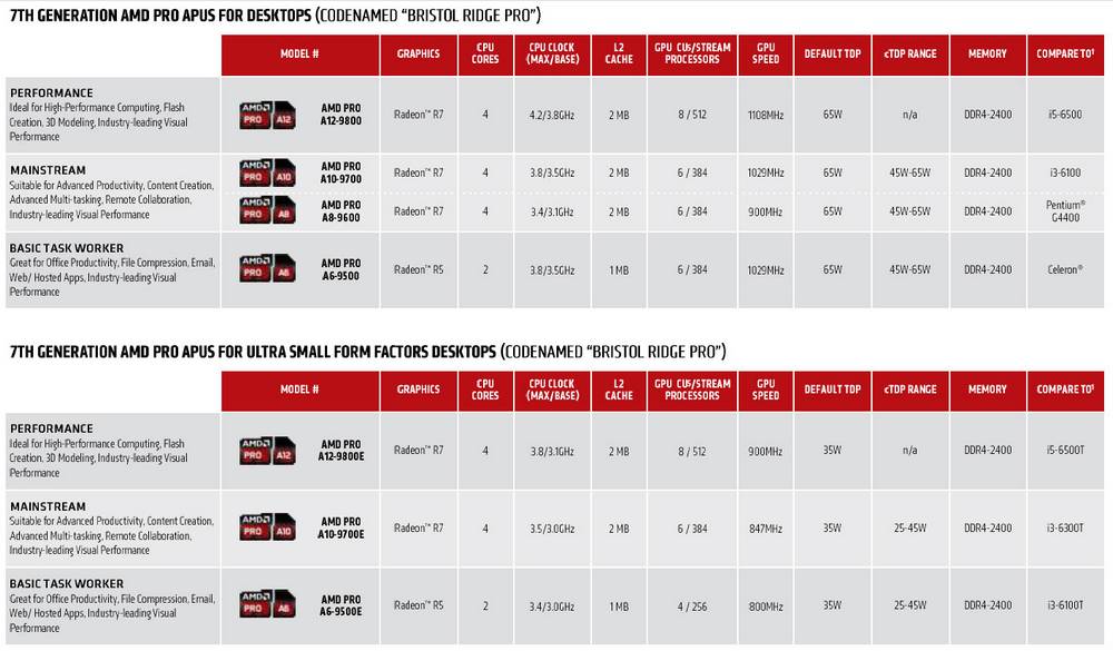 Bristol Ridge Pro ini akan hadir dalam varian TDP standar 65 W dan varian TDP rendah 35 W. Secara keseluruhan, AMD menawarkan 7 APU Bristol Ridge Pro. Spesifikasi dari APU-APU tersebut bisa dilihat di tabel di bawah ini: