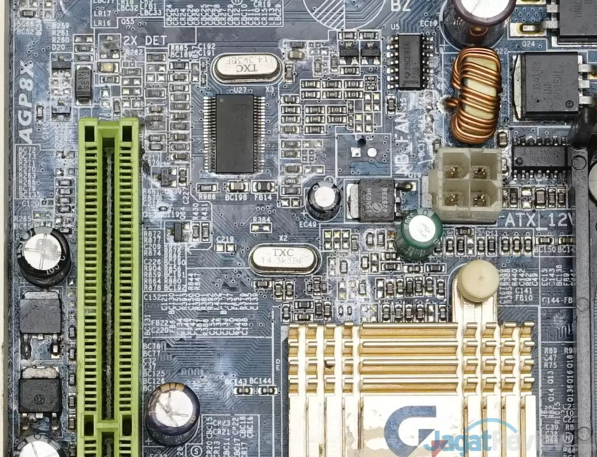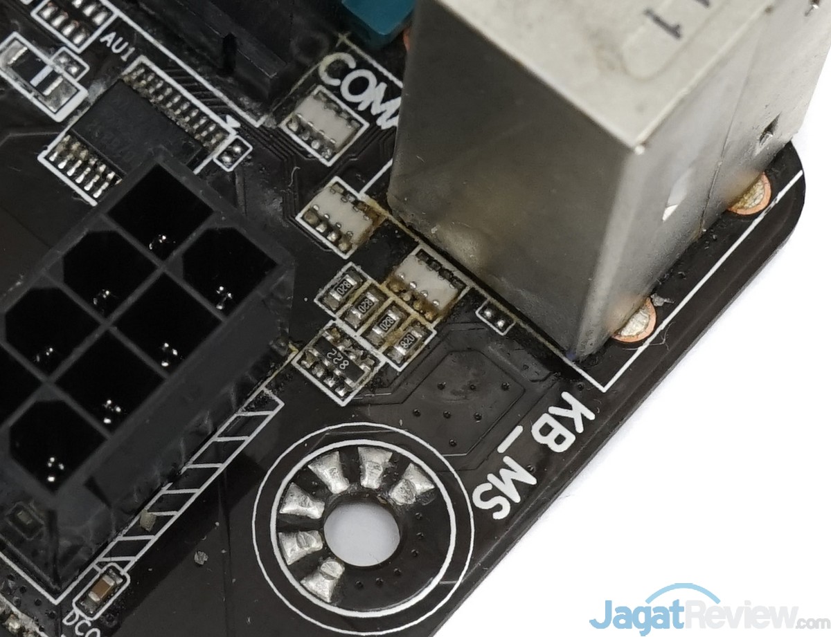 Selain itu, hampir semua komponen resistor dan kapasitor SMD yang ada di motherboard Gigabyte H81M-S2PH ini masih bersih dan terbebas dari korosi. Hanya ada beberapa resistor dan kapasitor SMD mengalami korosi yang kami temukan di bagian pinggir motherboard, di sekitar konektor ATX12V+ dan PS/2.