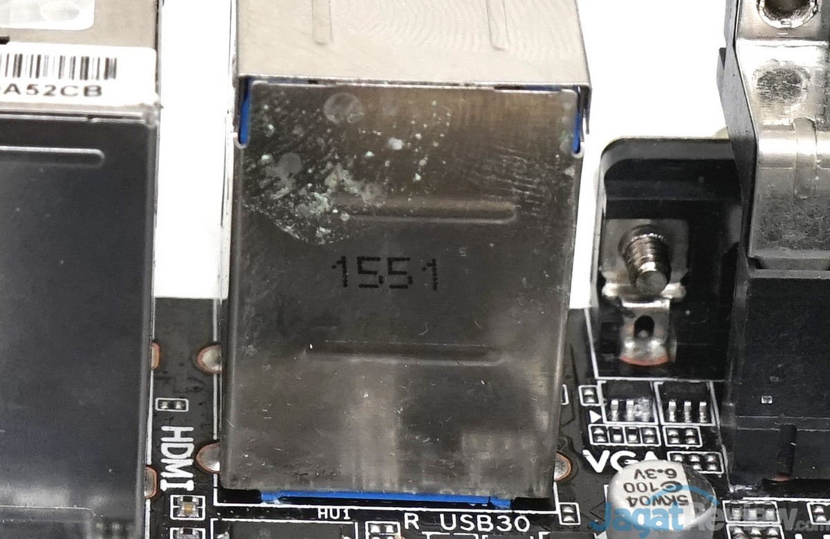 Kami juga menemukan sedikit korosi pada logam yang menutupi komponen back-panel USB 3.0 pada motherboard Gigabyte H81M-S2PH.