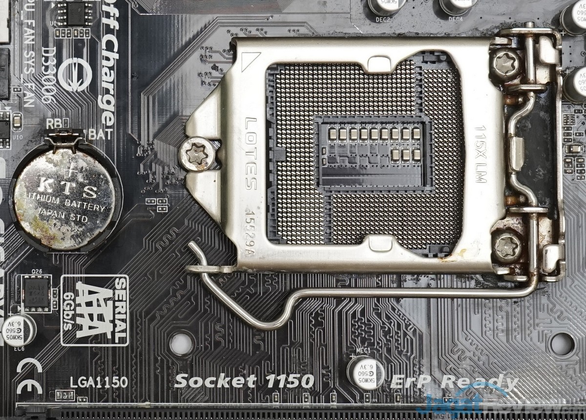 Korosi yang terjadi pada bagian baterai CMOS dan pengunci socket LGA 1150, yang sudah terlihat sebelumnya, semakin memburuk. Sudah terlihat karat berwarna coklat pada permukaan baterai dan beberapa spot di bagian pengunci socket LGA 1150. Hanya saja, kami melihat, pin-pin LGA yang ada masih terlihat bersih dan tidak mengalami korosi.