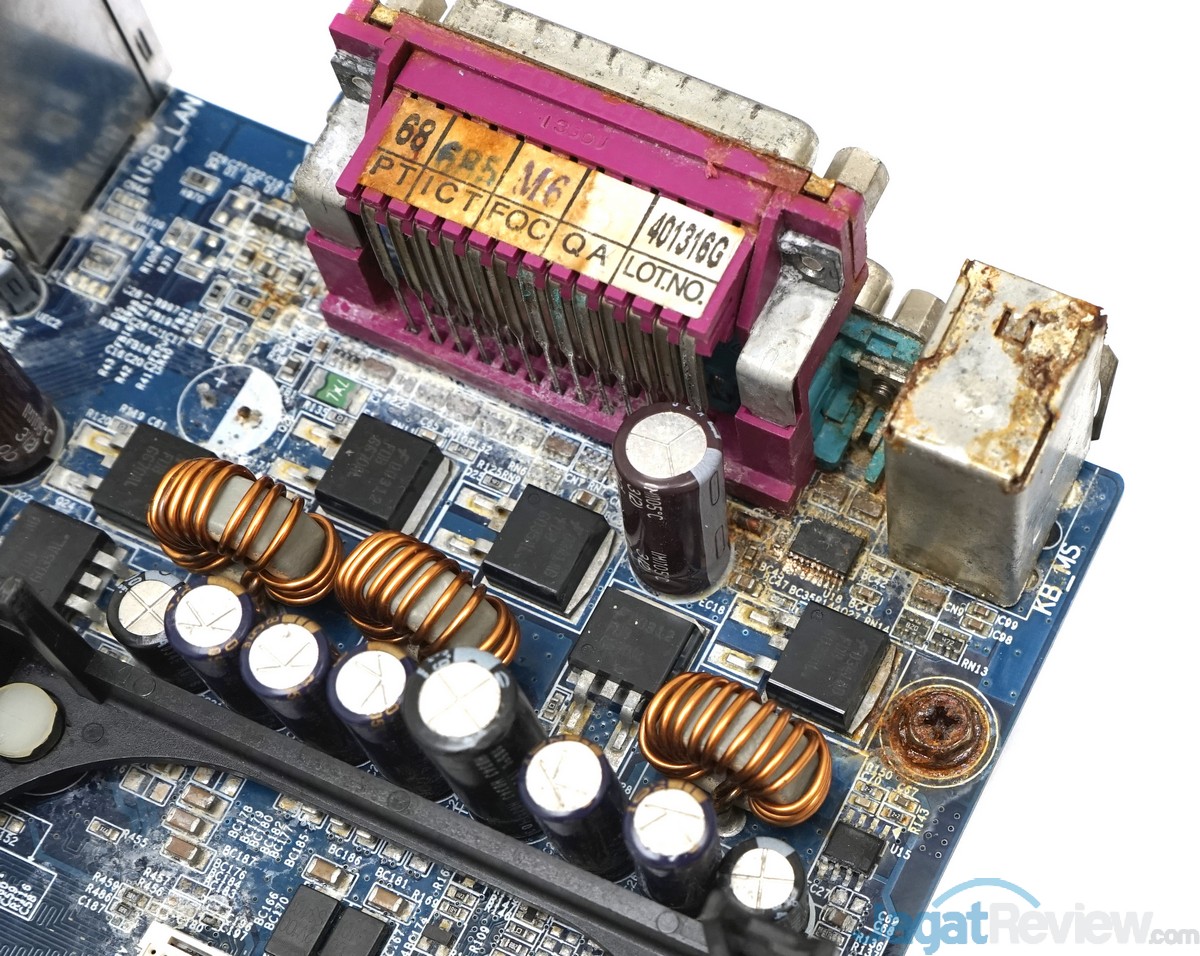 Sebagian besar kapasitor dan resistor SMD yang ada pada motherboard Gigabyte 8TRS300M telah diselimuti oleh korosi. Beberapa bagian motherboard pun telah ditutupi karat kecoklatan dengan sempurna. Lalu, bagaimana dengan H81M-S2PH?