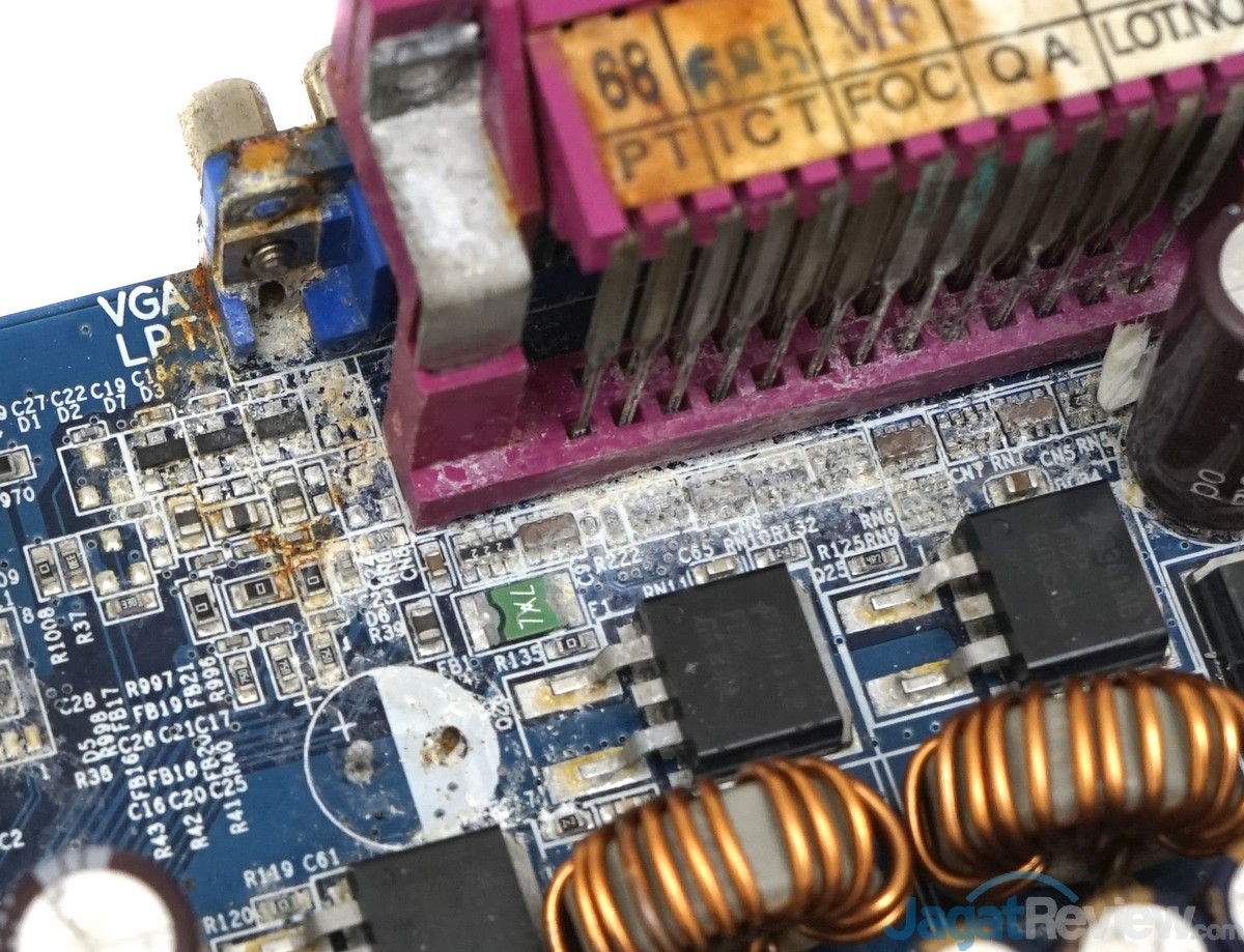 Setelah 1 minggu, kami mulai dapat melihat tanda-tanda korosi yang mulai bermunculan hampir seluruh bagian motherboard Gigabyte 8TRS300M ini.