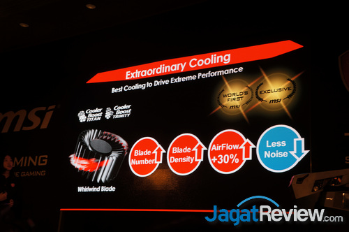 Pada gaming laptop dengan komponen beperforma tinggi, pendingin yang mumpuni mutlak diperlukan untuk menjaga durability dari komponen yang ada. MSI mengimplementasikan fitur Cooler Boost pada beberapa model notebook mereka, yakni pendingin yang didesain secara khusus oleh MSI untuk gaming notebook kelas atas, untuk menjaga kestabilan komponen.