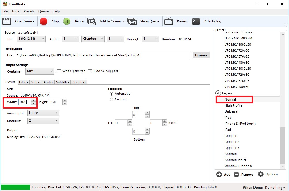 Handbrake 1.0.2 merupakan salah satu aplikasi transcoding video gratis yang cukup popular. Aplikasi tersebut mampu memanfaatkan jumlah Core/ thread yang besar (8+) pada prosesor, dan sangat menyukai prosesor dengan performa tinggi. Oleh karena itu aplikasi ini sangat ideal untuk menguji “kekuatan” sebuah prosesor. Kami mengubah movie Tears of Steel di resolusi 4K(MOV, 6.3GB) ke preset Normal dengan ukuran Full HD yang tinggal berukuran 400 MB saja. Makin cepat konversi ini dilakukan, makin bagus.