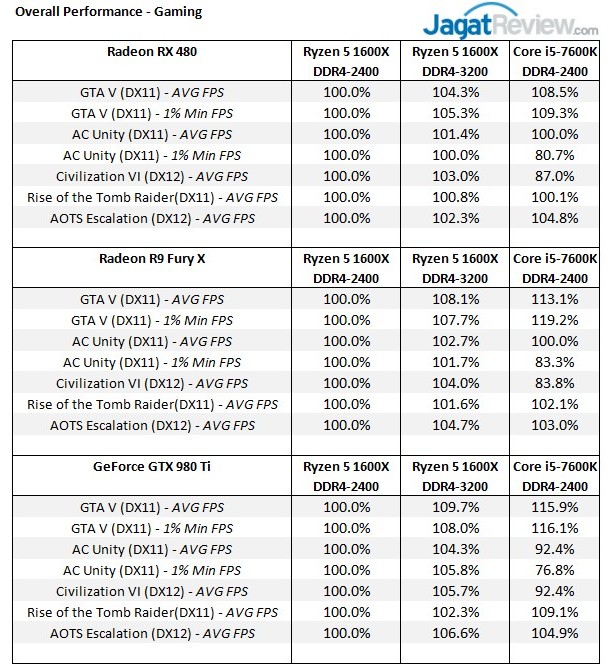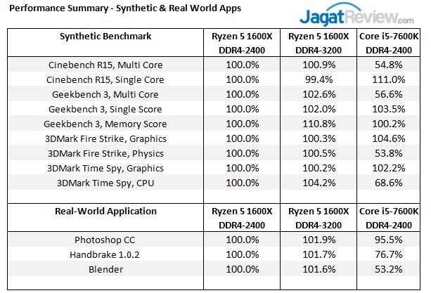 Anda yang menginginkan ekstra performa dengan Ryzen 5 bisa memasang DDR4 yang kencang untuk mendapat 7-9% ekstra performance lagi, dan overclocking RAM ini berpotensi memperkecil jarak performa gaming Ryzen 5 1600X dengan 7600K.