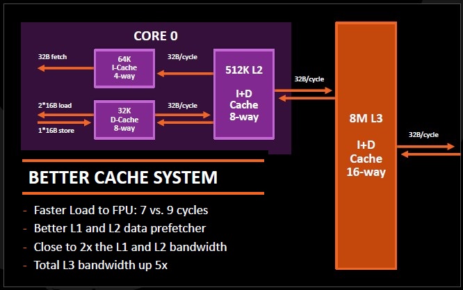 Salah satu target untuk Zen adalah memiliki performa dan throughput tinggi. Untuk mencapai hal tersebut, selain melakukan desain ulang besar-besaran pada bagian core-nya, AMD mengimplementasikan high-bandwidth, low-latency cache. AMD mengklaim bahwa desain mereka ini menghasilkan 2x L1/L2 Cache bandwidth, dan juga 5x L3 Cache bandwidth dari desain sebelumnya.