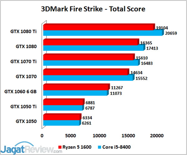 Sementara untuk 3DMark Fire Strike, benchmark ini memberikan gambaran terkait performa yang bisa ditawarkan untuk game-game DirectX 11. Benchmark ini menyuguhkan hasil yang cukup menarik, di mana sistem dengan Core i5-8400 menghasilkan combined score yang jauh lebih tinggi untuk graphics card kelas atas (GTX 1070, GTX 1070 Ti, GTX 1080, dan GTX 1080 Ti), sementara untuk graphics card kelas menengah, dua sistem yang digunakan menawarkan skor di kisaran yang kurang lebih sama. Hal itu berimbas pada total score, di mana untuk graphics card kelas atas Core i5-8400 terlihat unggul hingga sekitar 8%.