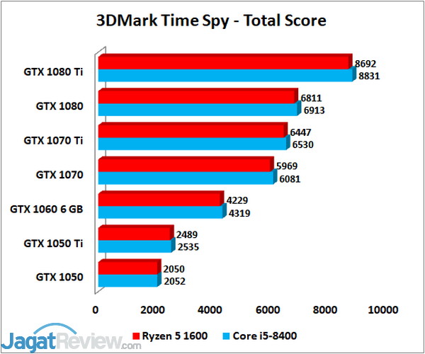 Benchmark 3DMark Time Spy akan memberikan gambaran kemampuan yang akan ditawarkan oleh sistem untuk game berbasis DirectX 12. Terlihat, kedua sistem bisa dikatakan menawarkan performa yang kurang lebih sama, dengan selisih hanya hingga 2% saja, di berbagai graphics card yang digunakan. Core i5-8400 dan Ryzen 5 1600 bisa dikatakan hampir sama kuat di benchmark ini.