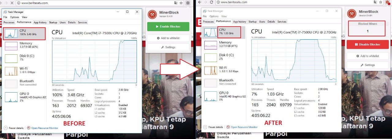 Ketika Miner Block ini aktif, Anda bisa beraktivitas seperti biasanya di website dengan kode miner tanpa perlu khawatir resource PC akan dihabiskan oleh “website miner” tersebut.