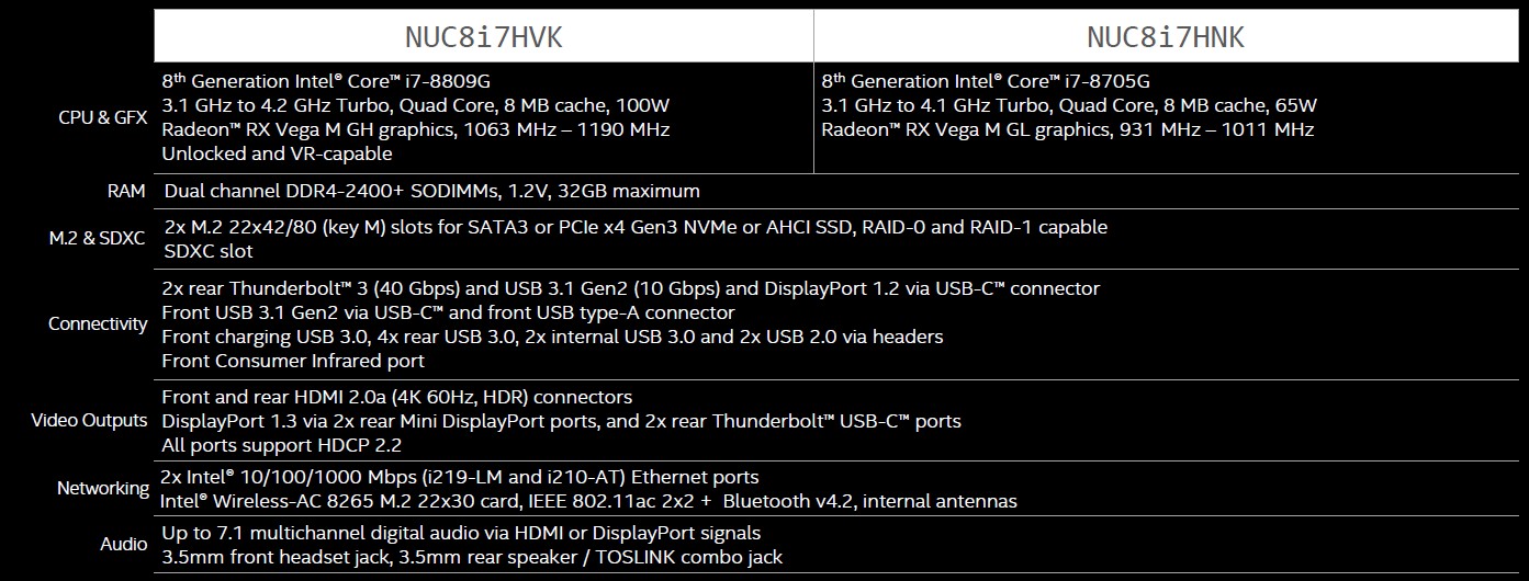 Terlihat, hal yang membedakan kedua NUC baru tersebut hanya prosesor yang digunakan. NUC8i7HVK menggunakan prosesor Core i7-8809G, yang merupakan prosesor tertinggi dari keluarga Core 8th Gen. dengan Radeon RX Vega M. Sementara NUC8i7HNK menggunakan prosesor Core i7-8705G. Perbedaan prosesor itu juga berarti GPU Radeon RX Vega M yang digunakan keduanya akan berbeda, disesuaikan dengan yang diusung oleh prosesor masing-masing.