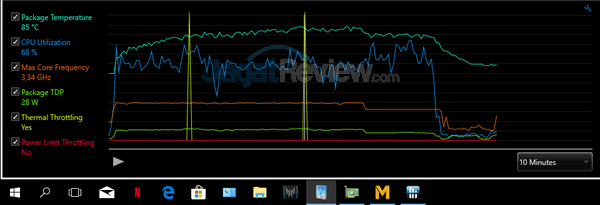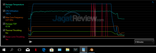 Sementara saat menggunakan kecepatan kipas 100% (CoolBoost On & Off) di skenario yang sama, kami tidak menemukan gejala thermal/power throttling dengan prosesor bekerja pada kecepatan 3,38 GHz di rating TDP 45 Watt.