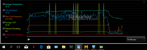 Pada skenario gaming yang sama kami masih menemukan gejala thermal throttling pada Core i7 7700HQ meskipun sudah menggunakan kecepatan kipas maksimal. Padahal temperatur tidak terlampau tinggi di bawah 80 °C. Gejala thermal throttling yang terjadi seharusnya tidak mengganggu performa sistem selama memainkan game. Kecepatan kerja prosesor saat terjadi gejala thermal throttling masih relatif sama seperti saat tidak terjadi thermal throttling di kisaran 3,3-3,4 GHz dan hanya terjadi dalam sekejap, tidak dalam waktu yang lama.