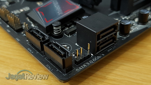 Opsi media penyimpanan lain, selain slot M.2, ada 4 buah port SATA III 6 Gbps. 2 diantara keempat port tersebut diletakan dengan angle 90°, dan diposisikan bertingkat, satu di atas yang lain. Sementara untuk dua port yang lain diletakkan di sudut kanan bawha motherboard.