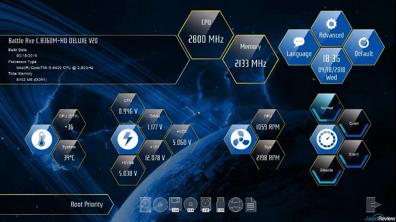 Seperti kebanyakan motherboard masa kini, Colorful C.B360M-HD Deluxe V20 juga memiliki fitur easy mode, di BIOS. Sesuai namanya, easy mode ini akan membantu pengguna pemula, menampilkan hanya opsi pengaturan dasar yang akan banyak dibutuhkan, sehingga tidak membingungkan pengguna pemula. Anda dapat mengatur boot override hanya dengan menarik icon di bawah. Tersedia juga pengaturan untuk kecepatan kipas yang terpasang ke motherboard. Kemudian, di tampilan ini, Anda juga dapat melakukan pemantauan kondisi sistem Anda dengan informasi yang cukup lengkap.