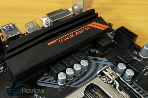 Untuk pasokan daya, motherboard ini memiliki 24-pin ATX dan 8 pin ATX-12v CPU. Peletakan konektor 8-pin menurut kami sudah berada pada posisi yang tepat. Sementara untuk konektor 24-pin, posisinya agak ke atas, sehingga bisa saja sedikit menganggu pemasangan di beberapa casing, terutama yang memiliki lubang cable management di posisi yang tidak sesuai dengan posisi konektor tersebut. VRM di motherboard ini dilindungi oleh heatsink VRM yang berukuran tidak terlalu besar, tetapi terbilang cukup kokoh. Motherboard ini juga dilengkapi komponen VRM 6 phase. Dengan konfigurasi VRM 6 (4+2) phase ini, kami merasa ini sudah cukup untuk bisa mengakomodasi CPU 6-core Coffee Lake untuk seri non-K.