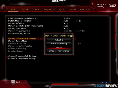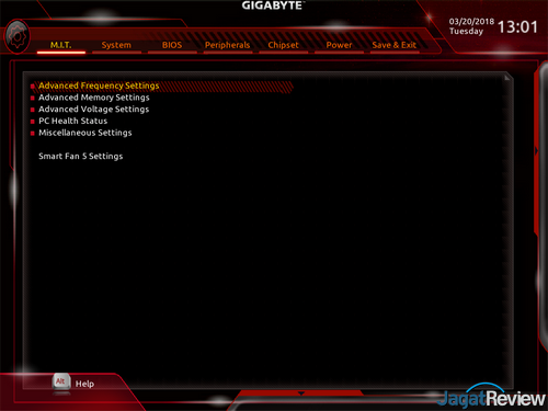 M.I.T: adalah tab yang berisi opsi-opsi konfigurasi utama yang bersangkutan dengan kinerja CPU dan RAM. Bagian ini biasanya diakses oleh orang yang ingin melakukan tuning terhadap performa sistem. Namun, satu hal yang perlu diingkat, tidak ada opsi pengubahan multiplier ke angka yang lebih tinggi dari standar bawaan prosesor. Hal ini merupakan batasan dari chipset B360, di mana chipset tersebut memang tidak mendukung unlocked multiplier.
