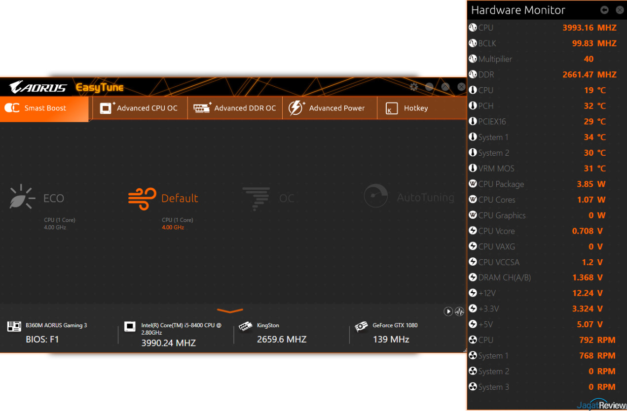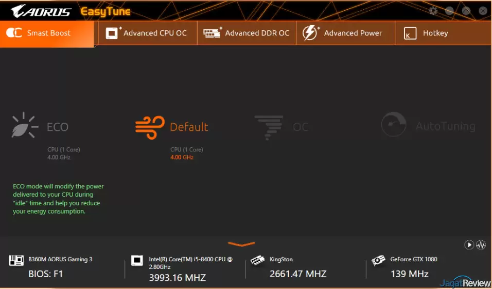EasyTune: Utility ini menyediakan opsi tuning performa yang dapat diakses dengan mudah dari dalam sistem operasi. Terdapat 5 menu di aplikasi ini, yaitu Smart Boost, Advanced CPU OC, Advanced DDR OC, Advanced Power, dan Hotkey. Umumnya, pengguna bisa melakukan overclocking dari menu Smart Boost. Namun, karena motherboard ini bukan menggunakan chipset Z Series, maka opsi yang ada hanyalah “ECO” atau “Default”.