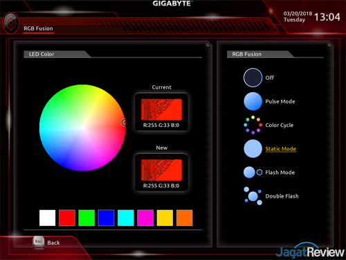 RGB Fusion: Sesuai namanya, utility ini merupakan pusat kontrol fitur RGB dan tata cahaya khas Gigabyte/Aorus. Utility ini akan mengijinkan Anda untuk melakukan setting untuk fitur RGB pada motherboard yang mendukung RGB Fusion, termasuk memilih preset, atau mengatur warna dan efek di setiap zona di motherboard. Salah satu fitur RGB yang menurut kami cukup intuitif terdapat pada tab “Intelligent”, di mana LED bisa diatur agar warnanya berubah sesuai angka dari sensor tertentu, seperti CPU Temp., CPU Usage, Fan Speed, dan lain sebagainya. Sangat disayangkan bahwa pada motherboard ini LED hanya terdapat pada jalur isolasi audio