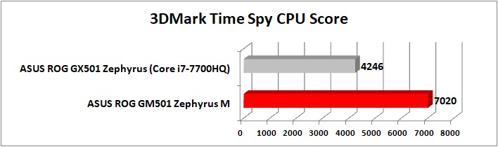 Catatan: karena ROG GX501 Zephyrus dan ROG GM501 Zephyrus M menggunakan GPU diskrit yang berbeda, kami hanya membandingkan skor pengujian di 3DMark yang terkait dengan performa CPU dan RAM saja, yaitu Physics Score/CPU Score