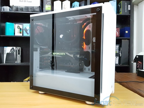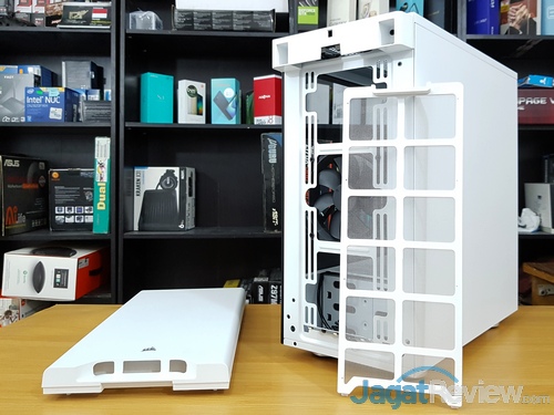 Sedikit kekurangan justru ada di side panel tempered glass, di mana bagian inilah justru yang perlu diperhatikan dengan baik oleh pengguna saat merakit sistem. Tempered glass dipasang dengan empat baut flat dengan lubang hexagon, yang bisa dibuka dengan kunci “L” yang disertakan di paket penjualan. Namun, bukan ini bagian yang agak merepotkan, melainkan keharusan memposisikan casing dalam posisi tidur untuk membuka maupun memasang side panel tempered glass, karena tidak adanya mekanisme untuk menahan tempered glass di posisinya setelah semua baut terlepas. Hal ini seharusnya bisa diatasi dengan mudah selama pengguna teliti dan sabar saat melakukan perakitan sistem.