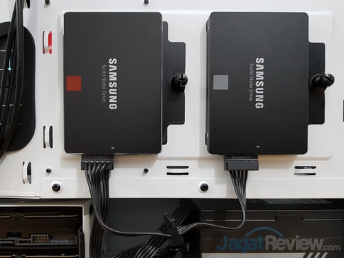 Beralih ke kabel-kabel untuk storage. Penempatan storage di casing ini sedikit membuat kami bingung, karena ketika storage dipasang di posisi tersebut, kami mendapati bahwa kabel SATA dari PSU yang kami gunakan tidak bisa mengakomodasi keenam storage yang terpasang. PSU Corsair TX650M yang kami gunakan memiliki dua kabel dengan konektor SATA, masing-masing kabel memiliki tiga konektor, dengan jarak antar konektor sekitar 10 cm. Dengan enam konektor di dua kabel tersebut, kami hanya bisa memasang kabel power ke lima dari enam storage yang kami gunakan. Hal ini disebabkan karena jarak antar storage terlalu jauh, sehingga di salah satu kabel, salah satu konektor harus kami “korbankan”, karena tidak bisa digunakan menjangkau satu storage yang tersisa.