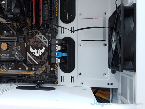 Terakhir, untuk menyelesaikan perakitan sistem, kami memasang kabel dari PSU ke tujuannya masing-masing. Menggunakan lubang-lubang cable management yang tersedia, kami bisa menyusun kabel dari PSU di casing ini dengan rapi, dan pemasangan kabel ke motherboard dan graphics card pun terbilang mudah. Sedikit catatan hanya ada di kabel CPU 8-pin, di mana karena posisi keluar kabel ada di ujung casing, sangat disarankan untuk memasang kabel tersebut terlebih dahulu sebelum memasang pendingin prosesor, terutama bila Anda menggunakan HSF dengan ukuran besar.