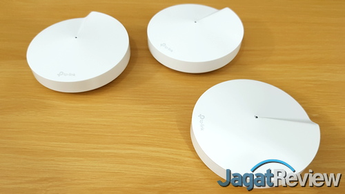 Di paket yang dipinjamkan TP-Link, terdapat tiga unit Deco M5, yang memiliki desain identik, dan masing-masing pun bisa berperan sebagai pusat dari sistem “Whole Home WiFi”. Unit tersebut hadir dengan desain minimalis, dengan bodi berbentuk tabung pendek warna putih dengan diameter 120 mm, dan satu lampu indikator. Ukuran perangkat ini bisa dikatakan cukup ringkas, sehingga mudah diletakkan di mana saja, tanpa membuang banyak ruang.