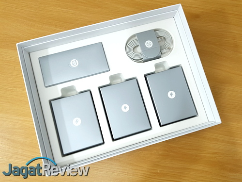 Seperti yang sempat kami sebutkan di atas, paket “Whole Home WiFi” berbasis Deco M5 yang kami terima dari TP-Link ini mengusung tiga unit Deco M5. Karena ukuran perangkat yang terbilang ringkas, kemasan paket penjualan Deco M5 ini memiliki ukuran tidak terlalu besar, sekalipun di dalamnya terdapat tiga buah router Deco M5. Selain tiga unit Deco M5, TP-Link juga menyertakan beberapa perlengkapan pendukung, yaitu: