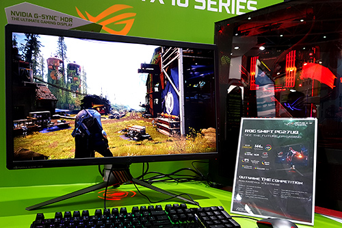 Selain itu, ada juga Big Format Gaming Display (BFGD), yang merupakan inisiatif dari NVIDIA untuk menawarkan monitor ukuran besar untuk gamer, dan diwujudkan ASUS dalam bentuk ROG Swift PG65. Monitor ini mengusung layar 65″ 4K UHD dengan kapabilitas HDR, dengan Quantum Dot yang memungkinkannya menawarkan color gamut yang luas, hingga 100% DCI-P3. Menariknya, dengan ukuran sebesar ini, ASUS masih menawarkan refresh rate hingga 120 Hz di monitor ini, serta tentunya fitur khas NVIDIA, G-Sync.