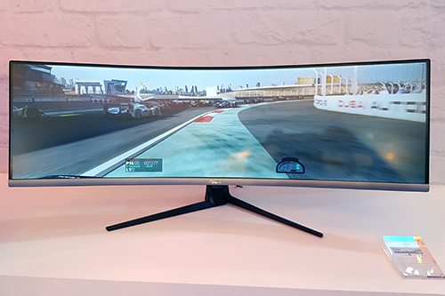 Sebuah monitor gaming dengan layar yang sangat lebar, rasio 32:9, juga ditampilkan ASUS, yaitu VG49V. Monitor ini menawarkan layar lengkung dengan diagonal 49″, Dual-Full HD, alias menawarkan resolusi 3840 x 1080 piksel, yang cocok untuk memainkan berbagai jenis game dengan tampilan yang berbeda dari biasanya, sangat lebar. VG49G ini juga menawarkan fitur FreeSync, dengan refresh rate hingga 144 Hz. Memanfaatkan layarnya yang sangat lebar, monitor ini juga dibekali kemampuan Picture-in-Picture, untuk menampilkan konten dari dua buah sumber sekaligus, masing-masing di rasio 16:9. ASUS juga mendesain monitor ini sebagai sebuah monitor curved untuk memudahkan pengguna menikmati konten di layarnya yang sangat lebar.