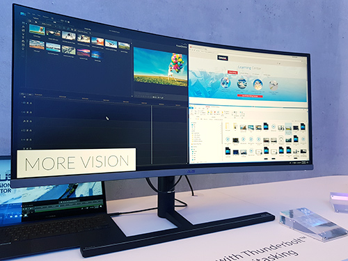 Selain itu, ada juga MX38VC, yang merupakan monitor 37.5″ dengan desain elegan, frameless, resolusi 3840 x 1600 piksel. Monitor ini hadir dengan desain lengkung, serta menawarkan beberapa fitur, seperti Qi Wireless Charging, serta speaker stereo 10-Watt ASUS Sonic Master yang juga dikembangkan bersama Harman Kardon. Menariknya, monitor ini bisa beroperasi dengan hanya satu kabel USB Type C, untuk data tampilan maupun daya.