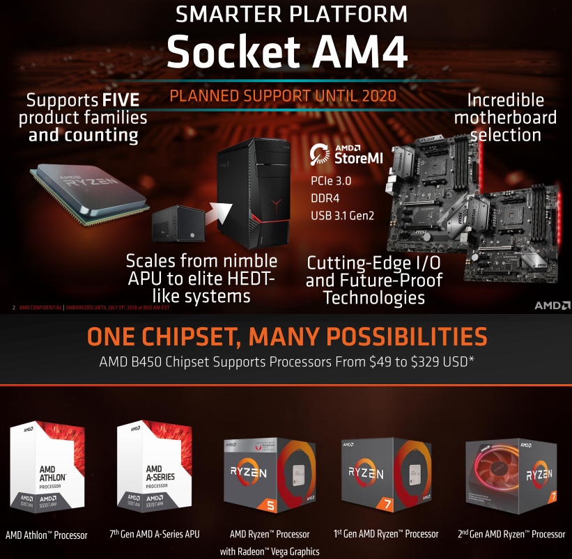 Prosesor AMD pada platform AM4 dirancang dengan fokus utama untuk menjadi platform yang fleksibel untuk menangani berbagai prosesor AMD di masa datang, dan menjadikan semua platform AMD menjadi satu soket saja, mulai dari kelas low-end Athlon ‘Bristol Ridge’, kelas menengah APU ‘Raven Ridge’, hingga Enthusiast-class Ryzen CPU ‘Summit Ridge / Pinnacle Ridge’ dengan 8-Core/16-thread.