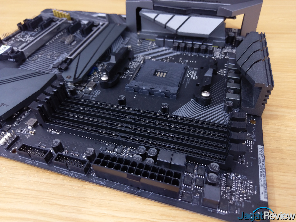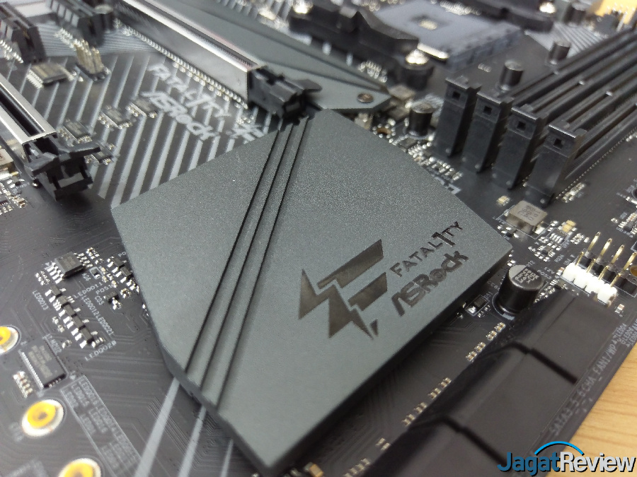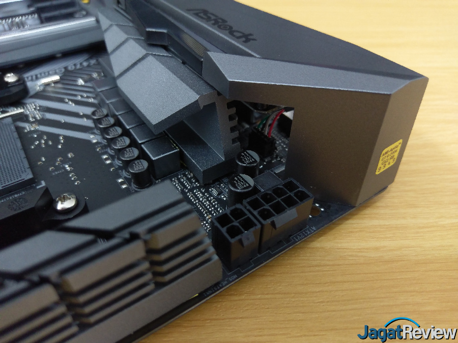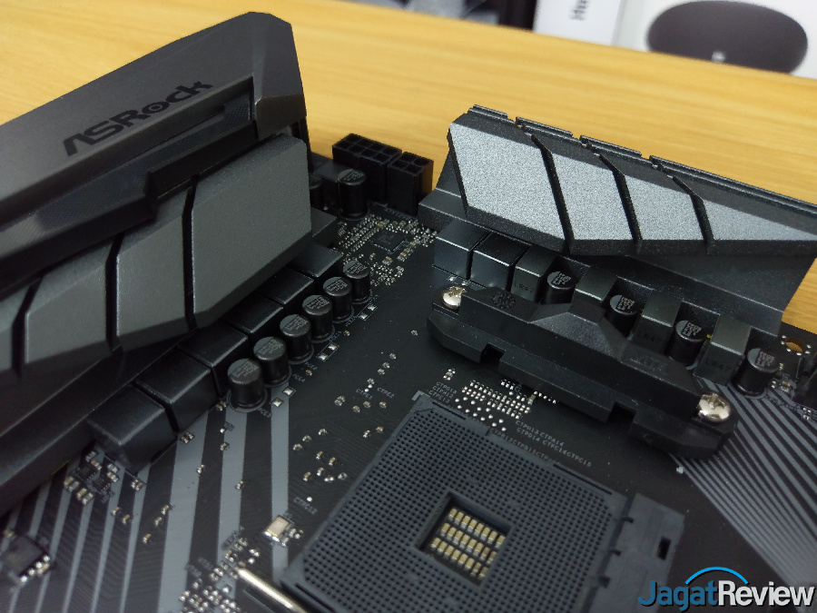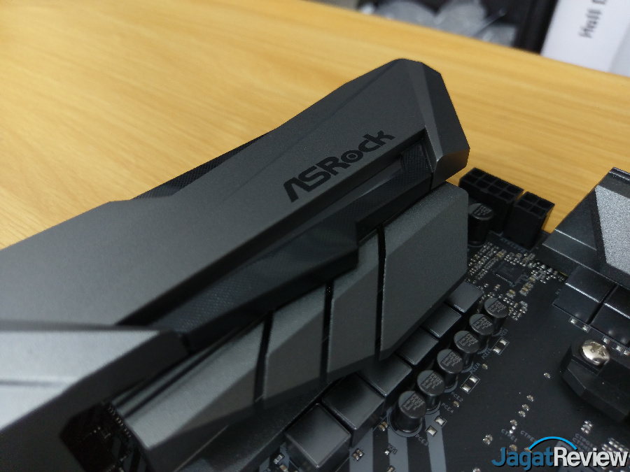 Heatsink Aluminum Alloy XXL yang digunakan untuk mendinginkan area VRM ini memiliki ukuran yang besar dan juga sudah cukup baik dari sisi surface area. Dari sisi desain, heatsink ini terlihat sediit berbeda dari heatsink yang digunakan untuk X470 Taichi. Untuk seri Fatal1ty ini, ASRock tidak memberikan heatpipe di heatsink. Motherboard ini sendiri menggunakan VRM 12 Phase (8 CPU + 4 SOC), yang menandakan bahwa motherboard ini disiapkan untuk bisa menjalankan prosesor Ryzen dari 4 hingga 8 core.