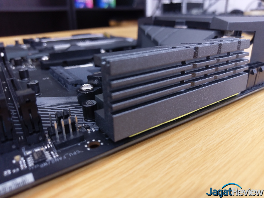 Terdapat 4 DIMM DDR4 yang mendukung DDR4 dengan kecepatan maksimal hingga DDR4-3466++. Kecepatan tertinggi yang didukung resmi oleh pihak AMD sendiri adalah DDR4-2933. Di atas kecepatan tersebut, user harus melakukan overclock manual, dan tidak ada jaminan dari pihak AMD bahwa frekuensi tersebut dapat dijalankan. Untuk motherboard Fatal1ty X470 Gaming K4 ini, Anda dapat melihat list QVL memori pada link ini: Memory QVL. Kapasistas maksimal dari RAM yang dapat digunakan pada motherboard ini adalah 64GB untuk konfigurasi 4x 16GB, dengan jenis Non-ECC Unbuffered DDR4. Empat slot DIMM ini juga dibalut warna hitam.