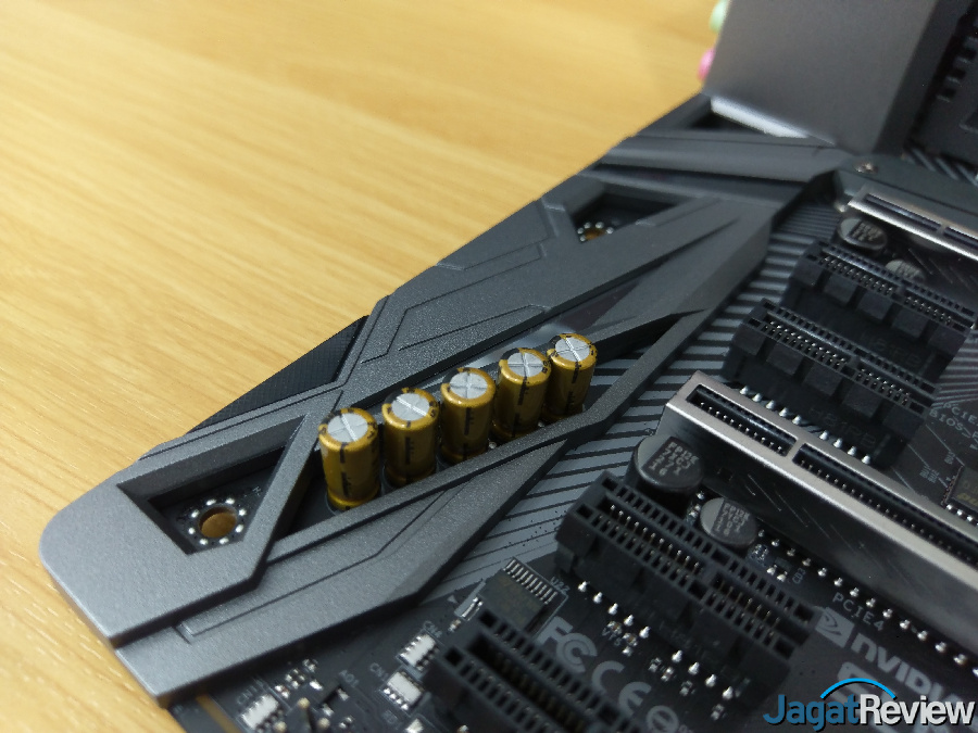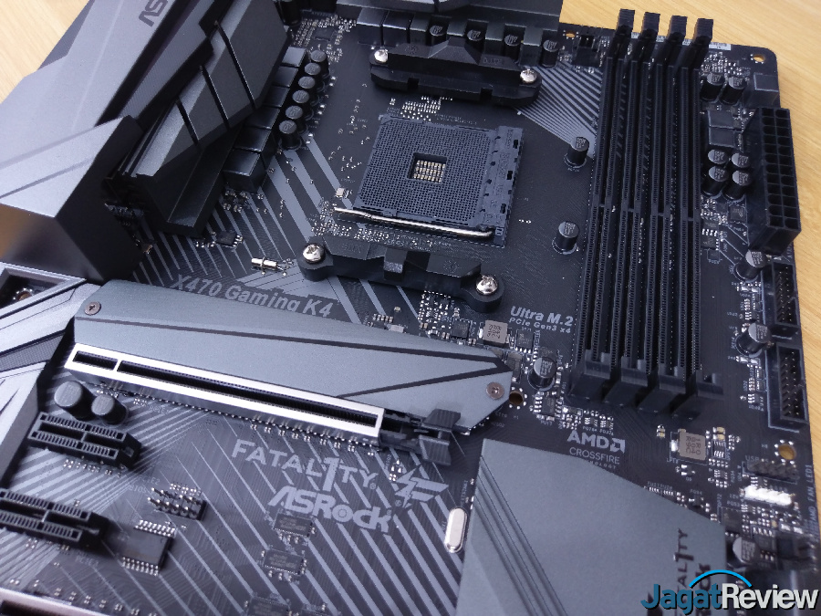 Untuk konektivitas storage, motherboard ini menyediakan 2 buah slot M.2 yang keduanya dapat berjalan pada mode NVMe dengan kecepatan PCIe x4. Anda harus memperhatikan saat memasang SSD M.2, karena dari kedua slot M.2 tersebut, 1 slot M.2 akan berjalan menggunakan PCIe bandwidth dari CPU dan satu slot lagi akan berjalan menggunakan bandwidth dari chipset X470. Slot M.2 pertama dilengkapi dengan cover M.2 yang menutup seluruh bagian SSD M.2 yang digunakan. Tidak lupa juga, di heatsink M.2 diberikan thermal pad cukup tebal. Peletakan kedua slot M.2 ini juga sangat berjauhan, slot pertama terletak di atas slot PCIe x16 pertama, sedangkan slot M.2 kedua terletak di bawah heatsink chipset