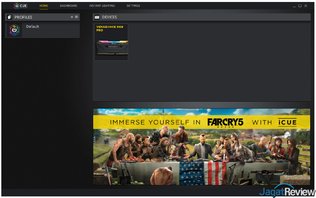 Di pembahasan kali ini, kami hanya akan membahas fungsi spesifik dari iCUE. Fungsi yang kami bahas itu terkait dengan pengaturan RGB LED dan tata cahayanya untuk Vengeance RGB Pro ini. Berikut ini adalah tampilan utama dari iCUE ketika kami memasang Vengeance RGB Pro ke sistem yang kami gunakan: