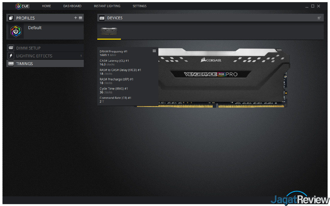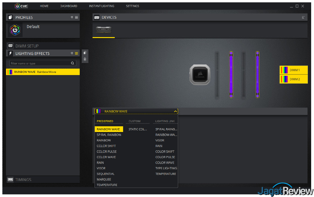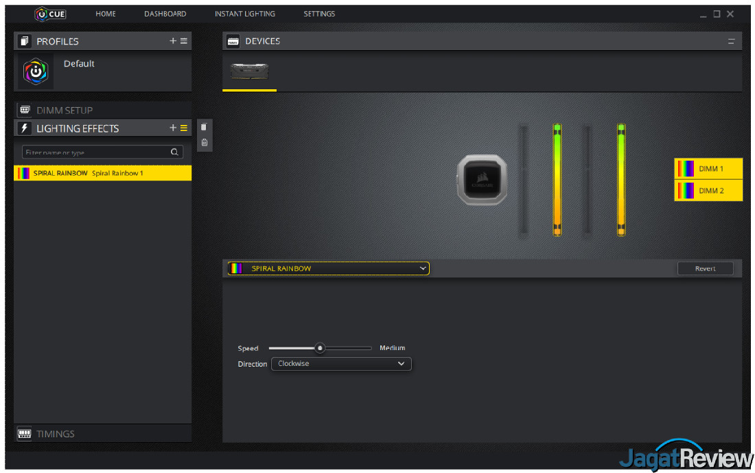 Ketika kami menekan icon Vengeance RGB Pro, sub menu akan terbuka dan menampilkan empat opsi, yaitu Profiles, DIMM Setup, Lighting Effects, dan Timings. Pertama, menu Profiles, ini adalah tempat Anda menyimpan atau memuat profile kustomisasi yang telah Anda lakukan pada Vengenace RGB Pro.