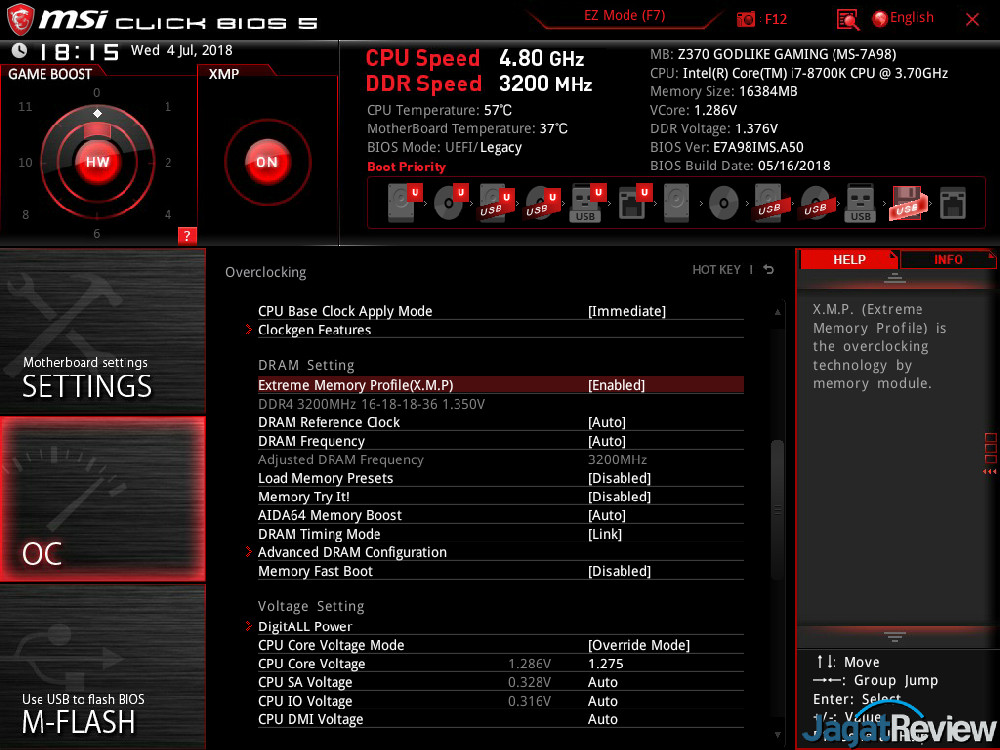 Untuk mendapatkan konfigurasi kecepatan RAM sesuai rating pada box-nya, maka setting XMP di BIOS harus diaktifkan. Proses mengaktifkan profil XMP RAM ini sangat mudah pada motherboard MSI Z370 Godlike Gaming yang kami gunakan. Pengguna hanya perlu masuk ke TAB OC dan memilih untuk mengkatifkan menu Extreme Memory Profile, dengan memillih opsi Enabled.