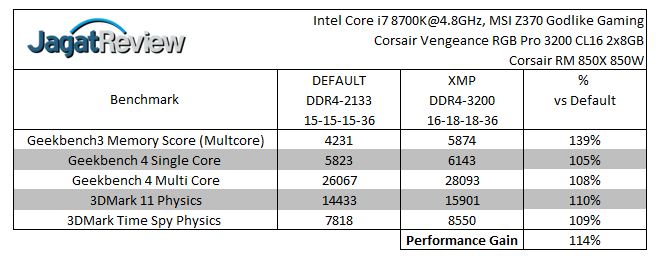 Rating XMP DDR4-3200 CL16 menunjukan peningkatan performa yang cukup terasa pada aplikasi memory intensive seperti 3DMark 11 Physics di mana peningkatan performa ekstra hingga 10% bisa didapatkan dengan hanya mengaktifkan XMP. Peningkatan terbesar didapatkan di Geekbench 3 Memory Score, mencapai 39%, dari default DDR4-2133 CL15 dan tergolong peningkatan yang cukup besar. Sedangkan pada benchmark lainnya yang digunakan, profile XMP ini juga masih menunjukan peningkatan performa 5-9%.