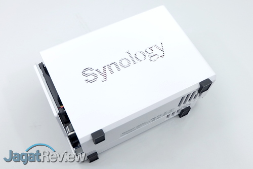 Sisi kiri dan kanan dari NAS ini terlihat agak polos, dengan hanya ventilasi yang dibentuk menjadi tulsian “SYNOLOGY”, yang juga menjadi salah satu ciri khas dari produk perusahaan yang satu ini. Sementara di sisi depan, terdapat tombol power dan sederet lampu indikator. Tombol power di NAS ini dilengkapi dengan LED berwarna biru. Sementara lampu indikator yang tersedia digunakan sebagai penanda untuk status operasi, LAN, Disk 1, dan Disk 2.