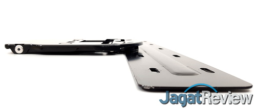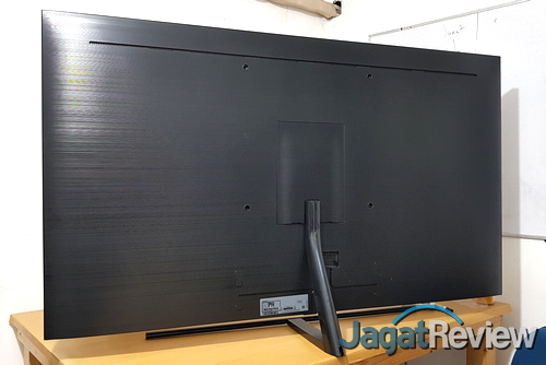 Beralih ke stand, Samsung menyertakan sebuah stand standar di paket penjualan dari TV QLED QA65Q9FN ini. Stand ini memiliki satu buah kaki dengan desain mendatar yang cukup panjang, yang tampaknya dimaksudkan agar stand tersebut bisa menahan TV dengan ukuran yang terbilang besar ini dengan baik. Secara umum, desain stand ini terbilang cukup menarik, serta masih senada dengan gaya elegan yang diusung. Menariknya, walaupun tidak memberikan kesan benar-benar kokoh, stand ini bisa menahan TV QA65Q9FN dengan baik sembari tetap mempertahankan desain elegan dari TV secara keseluruhan.