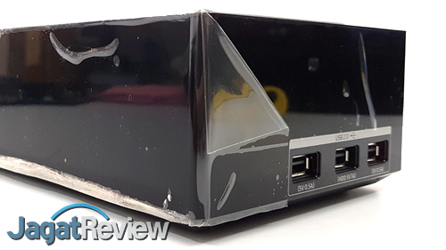 Terkait control box untuk QA65Q9FN, Samsung memang mencoba untuk membuat TV mereka terlihat lebih rapi tanpa banyak kabel terhubung ke TV tersebut. Sebagai gantinya, mereka memusatkan semua konektor yang dibutuhkan untuk penunjang konektivitas TV QLED 2018 di sebuah box terpisah. Control box untuk QA65Q9FN ini berukuran cukup besar, tetapi memang mengusung banyak konektor, yang membuat TV QLED ini memiliki opsi konektivitas yang luas. Adapun konektor yang tersedia di control box tersebut adalah: