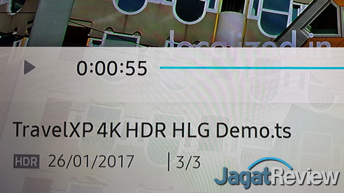 Berikutnya, kami mencoba menggunakan TV ini untuk memutar file video dari sumber lokal, memanfaatkan storage yang dipasang ke port USB di One Control Box. TV QA65Q9FN ini bisa menerima input dari storage dengan file system NTFS maupun FAT (FAT32 & exFAT). Kami juga mencoba menjalankan file dengan basis codec H.265, dan TV ini pun bisa menjalankannya dengan baik, hingga resolusi 4K sekalipun. Sementara untuk fitur seperti HDR, bila file yang digunakan mendukungnya, fitur itu juga akan aktif.