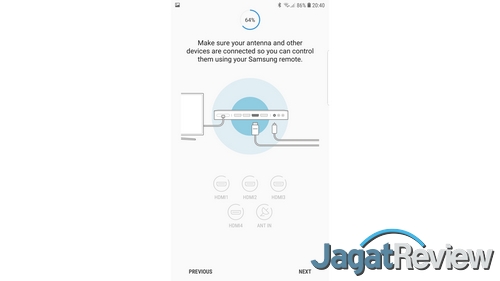 Sebagai sebuah Smart TV, QA65Q9FN tentu saja membutuhkan setup awal yang tidak hanya sekadar untuk fungsinya sebagai televisi, tetapi juga beberapa fitur “smart” lain. Salah satu yang utama tentu saja adalah menghubungkan TV ini ke jaringan lokal untuk koneksi ke Internet. Di TV QLED 2018 yang satu ini, Samsung menawarkan koneksi wireless, berupa WiFi dual-band, serta dengan menggunakan kabel Ethernet.