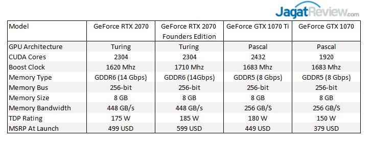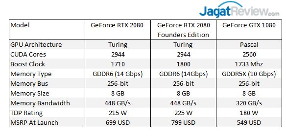 Berikut spesifikasi GeForce RTX yang sudah rilis kemarin di 20 Agustus 2018, dibanding beberapa GPU Pascal versi sebelumnya: