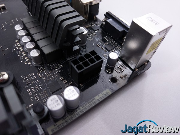 Untuk pasokan daya, motherboard ini memiliki 24-pin ATX dan 8-pin ATX 12v CPU. Untuk peletakan konektor 8-pin menurut kami kuranglah tepat, dikarenakan posisinya sedikit menjorok ke bagian dalam. Dengan posisi sedikit menjorok ke dalam, akan membuat proses pemasangan konektor di kondisi tertentu, seperti saat motherboard terpasang di casing yang agak sempit, menjadi lebih sulit. Sedangkan untuk konektor 24-pin, menurut kami sudah berada di posisi yang tepat, dan dapat dikatakan sudah menjadi standar peletakan konektor 24-pin di motherboard saat ini.