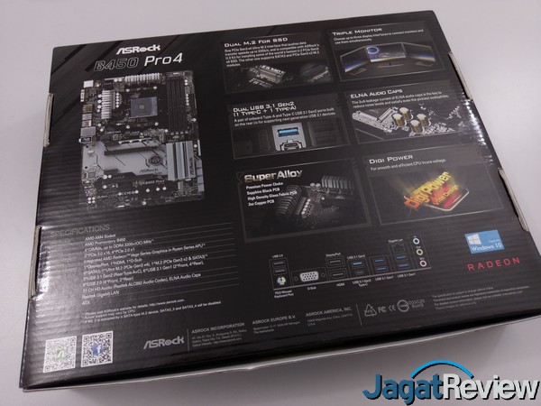 Di bagian belakang box ASRock B450 Pro4 ini, sama seperti motherboard lainnya, ASRock menampilkan informasi mengenai fitur-fitur utama yang dimiliki motherboard ini.