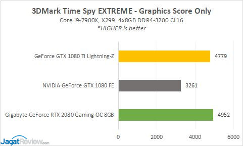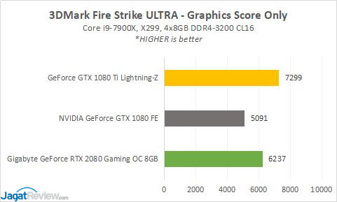 Dari sini, kelihatan bahwa RTX 2080 mengungguli GTX 1080 dengan cukup jauh. GTX 1080 Ti Lightning yang pre-overclocked nampak-nya kencang sekali di aplikasi DX11 (Fire Strike Ultra), namun agak kalah di aplikasi DX12 (Time Spy Extreme).
